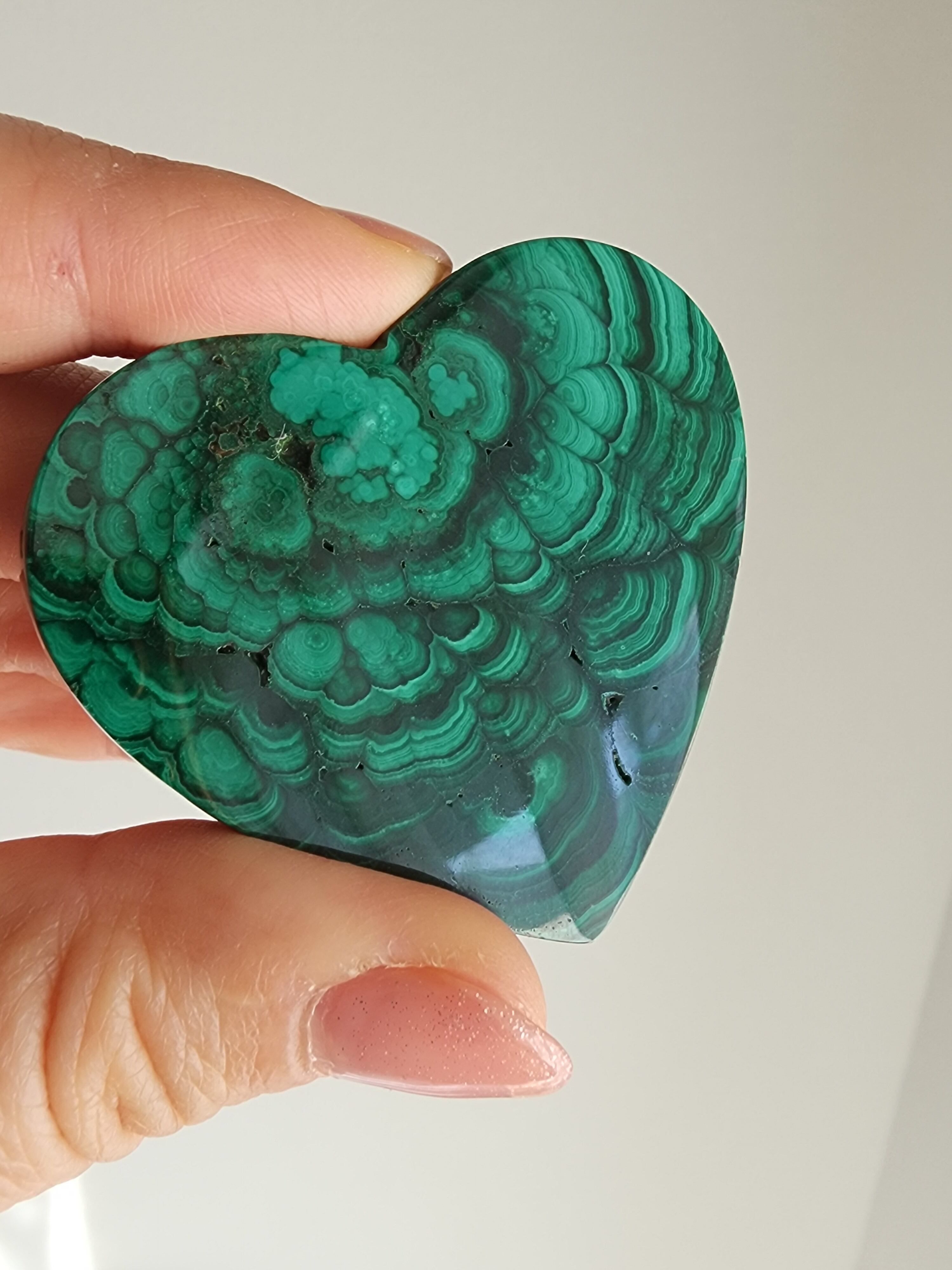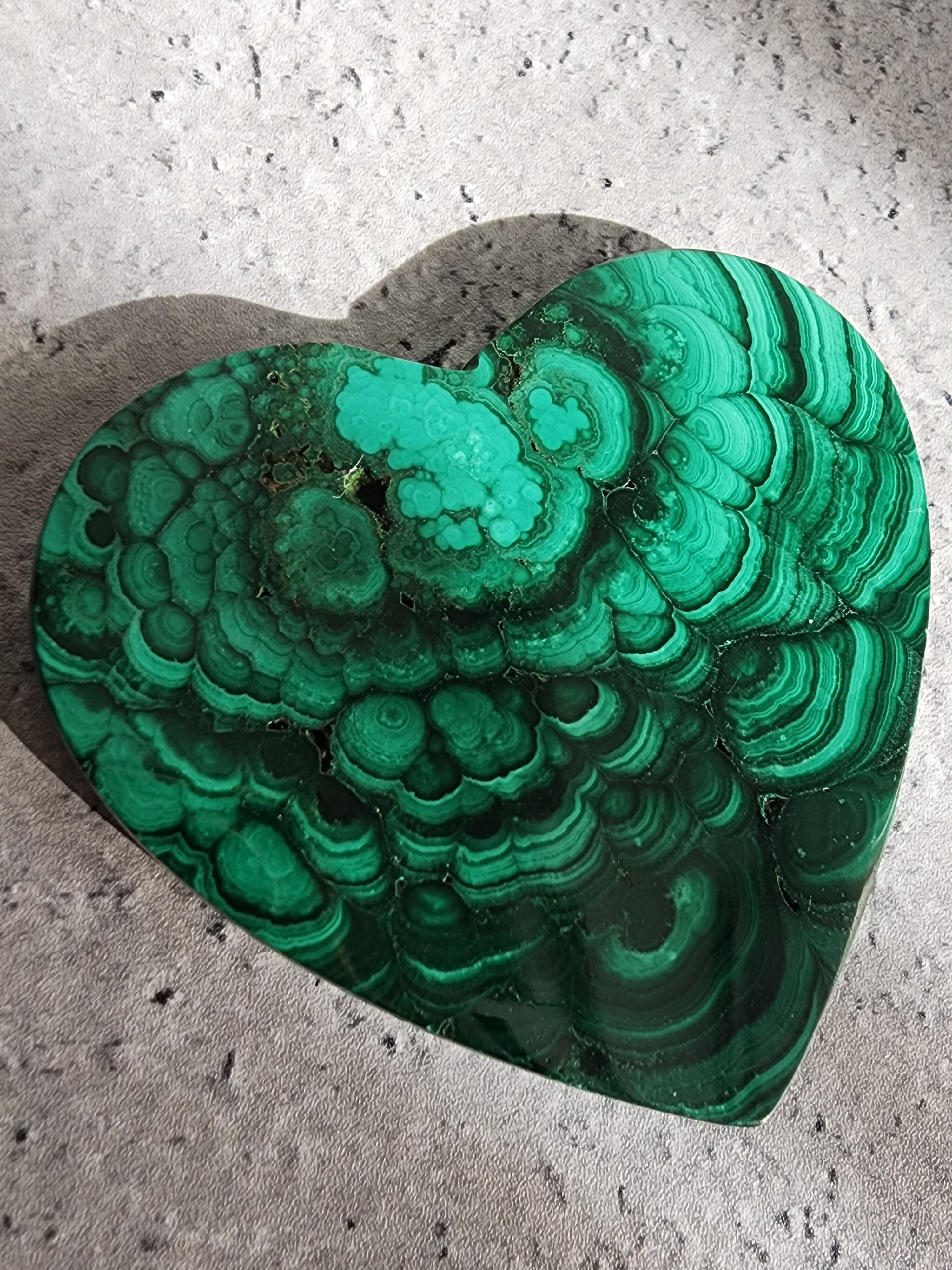 濃淡の縞模様が幾重にも重なり合い、まるで大地の記憶が刻まれたようなマラカイトのハートストーン。