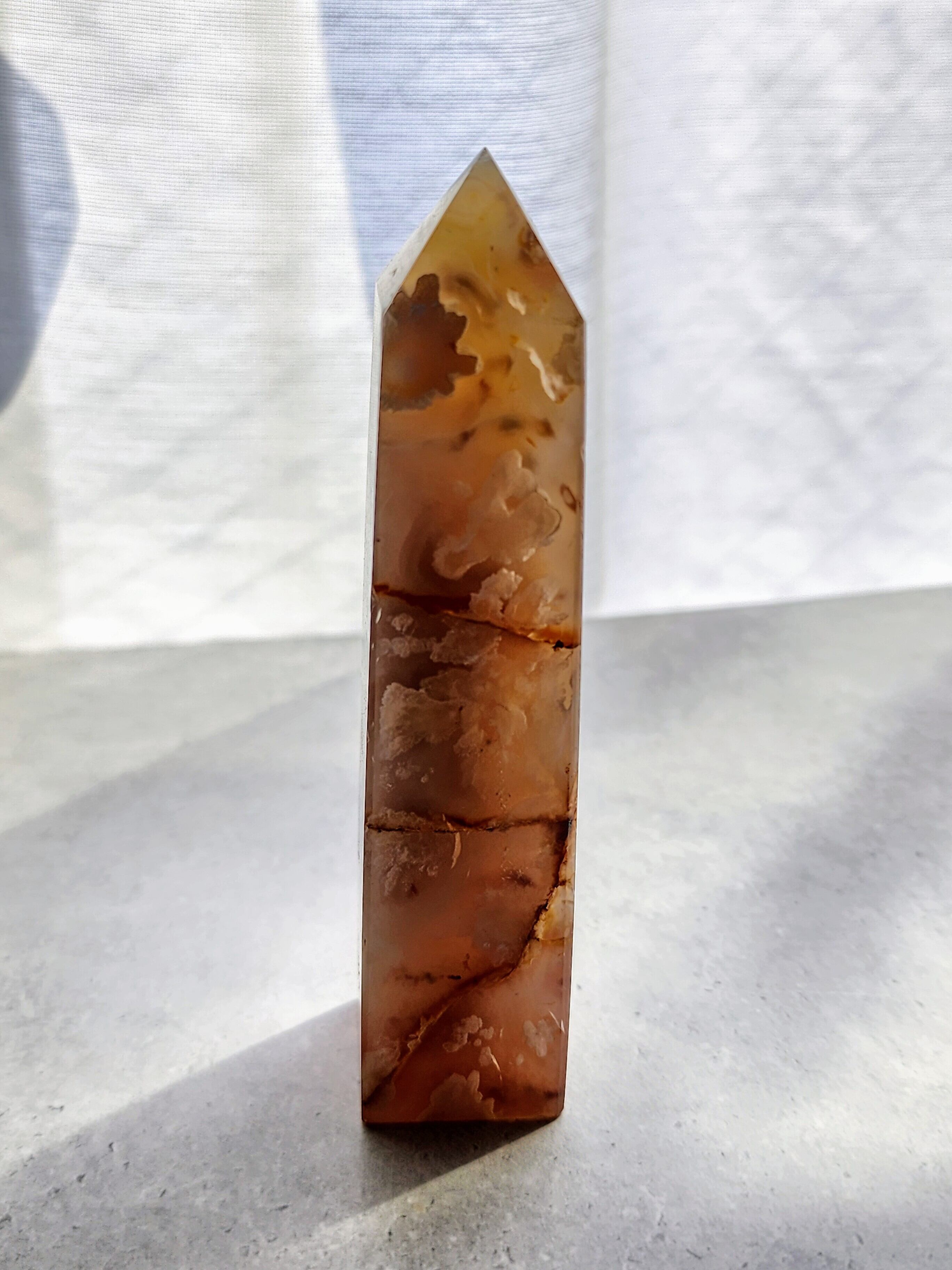 桜瑪瑙はその美しい花模様とともに、持ち主の波動を調節して、多くのポジティブなエネルギーをもたらします。