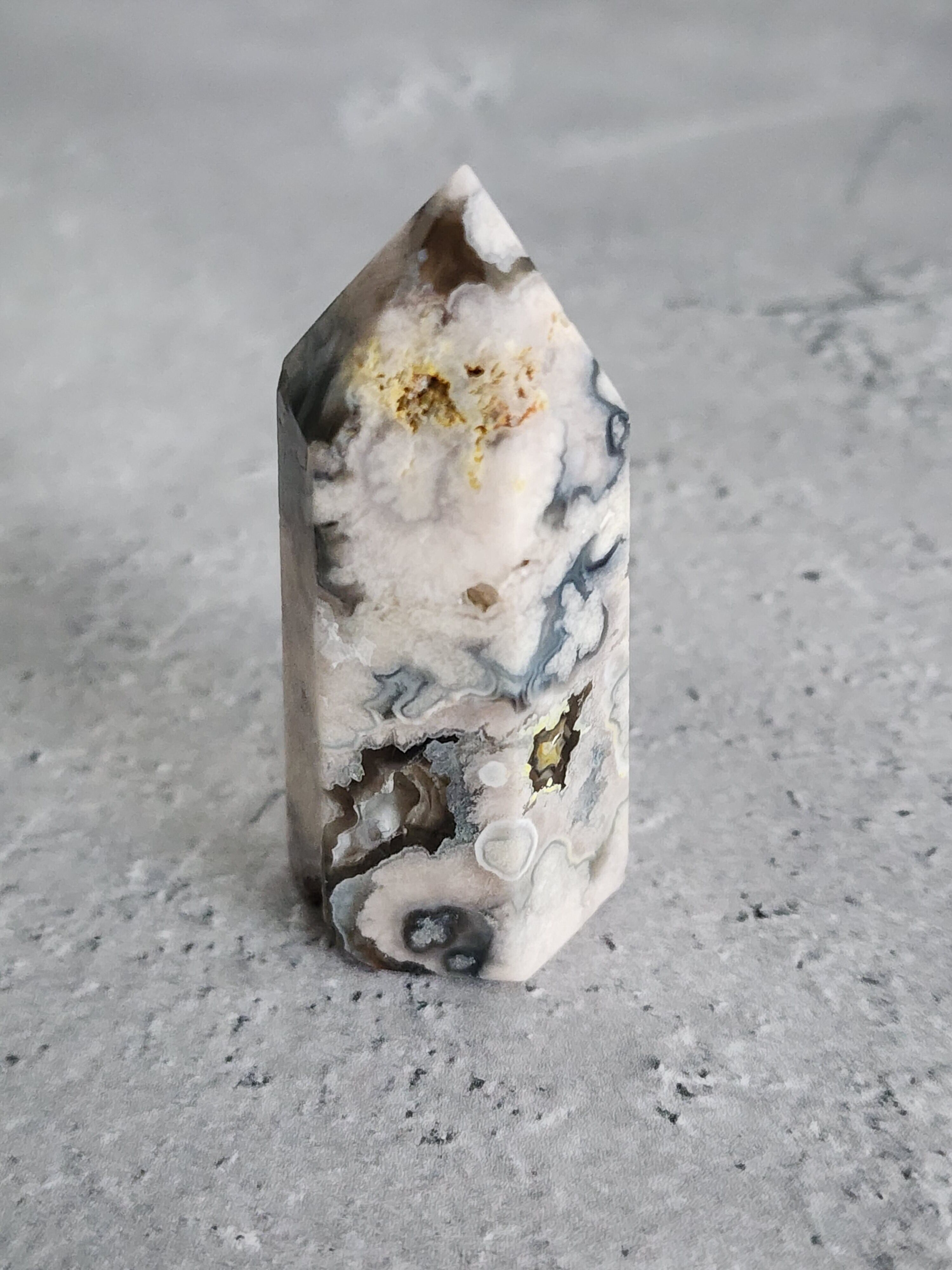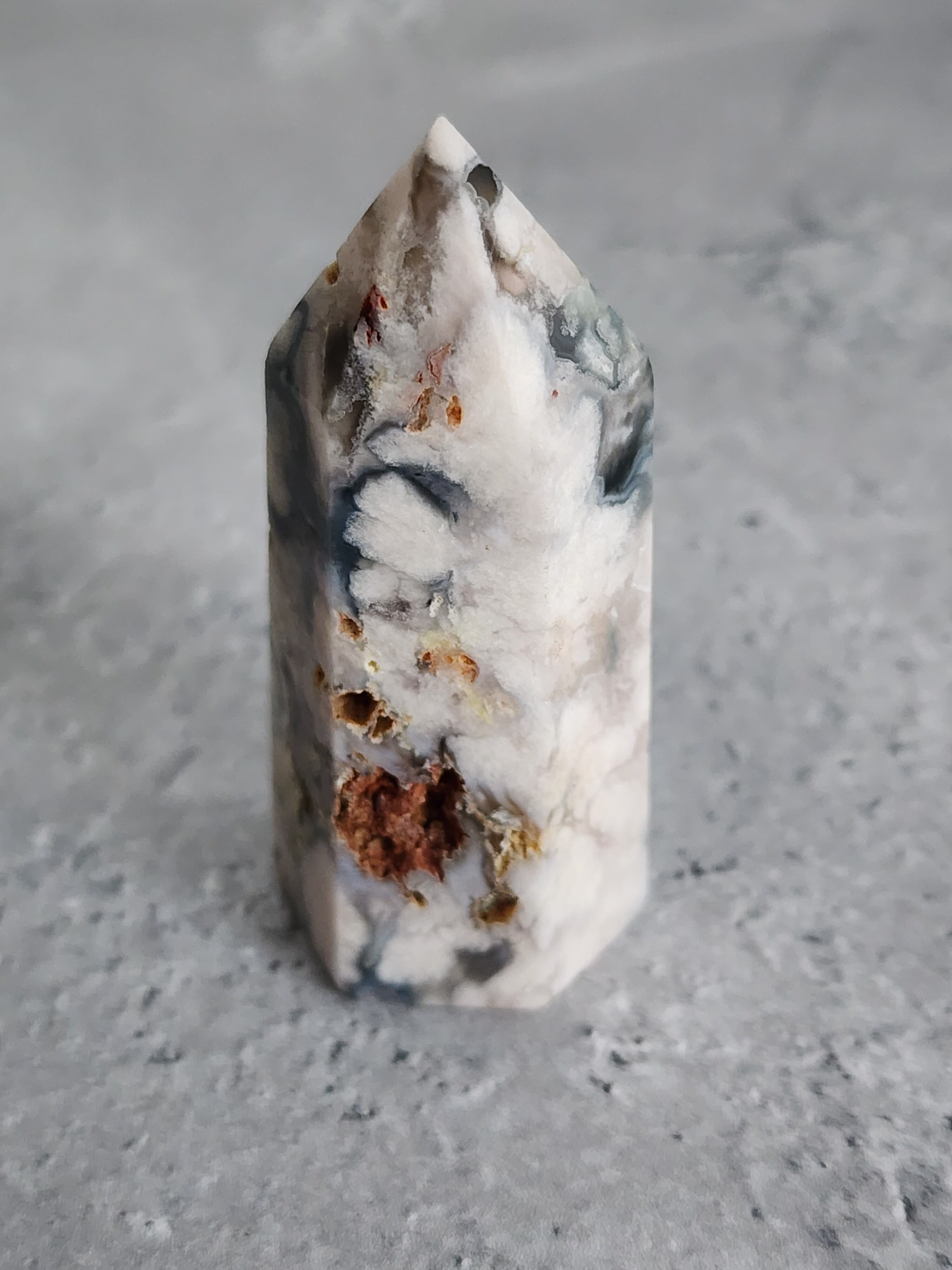 夜桜瑪瑙(チェリーブロッサムアゲート)は、ネガティブなエネルギーを取り除き、心を落ち着かせ、内なる平和をもたらすとされています。特に心の癒しに効果があり、ストレスや不安を和らげ、心の傷やトラウマを癒す力があります。